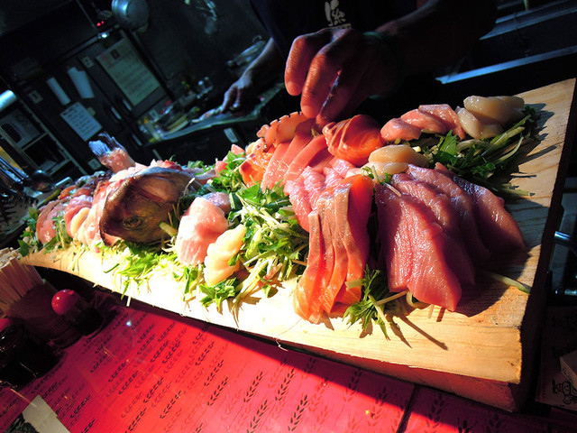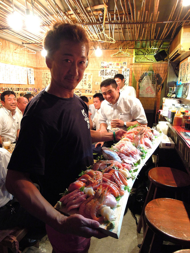 1メートルあるという舟にびっちり豪快に刺身のてんこ盛り。これで15人前、価格は宴会メニュー(7~8品、飲み放題付き/一人あたり)4000円。