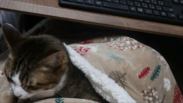 3日ほど経つと、仕事部屋のイスに「なんかあったかい、いい感じのやつが置いてある」ことがインプットされたようで、2匹が一緒に包まって寝ている様子も何度か見かけました。
