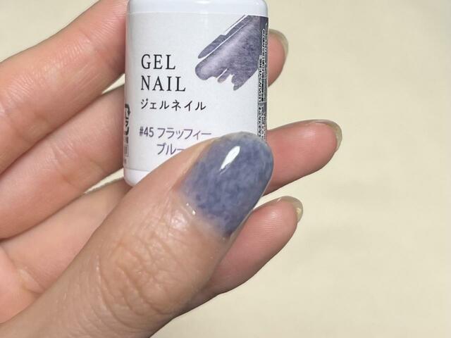 2度塗りをすると透明感のある青といった感じのツヤのあるちゅるんとした質感になります。また、繊維がはいっているので雑に塗っても可愛くきれいに仕上がりますよ!