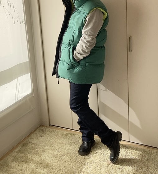 印象的なグリーンカラーのダウンベストを合わせてみました。