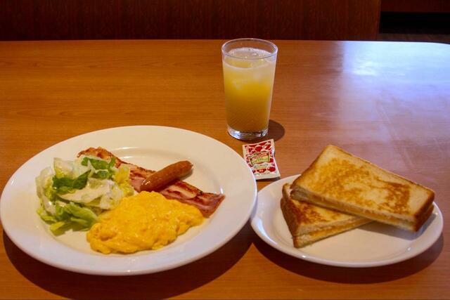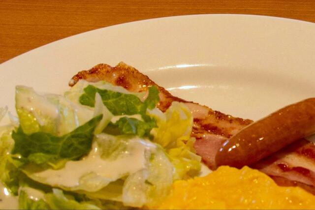 メインのおかずについているベーコンとソーセージもつやつやしていて美味しかったです。スクランブルエッグ、サラダ、ベーコン&ソーセージの量もちょうど良く、満足感と幸福感が程よく満たされます。