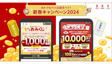 「おトクなペイは楽天ペイ 新春キャンペーン2024」は、「楽天ペイアプリ内の楽天ポイントカードのお買い物分ポイント増量!新春おみくじ」と「楽天ペイアプリで送る!受け取る!新春おとしだま」の二つのキャンペーンで構成。「新春おみくじ」は12月27日10時から2月1日9時59分まで、「新春おとしだま」は新年1月1日0時から1月31日23時59分までとなる。