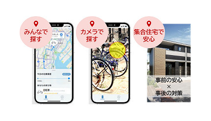 「盗難自転車探索サービス」は、自転車に装着できる盗難防止タグと専用アプリを連携することで、自転車の場所や移動経路を追跡するほか、ユーザー連携機能によりユーザー全員で盗難自転車を探すことも可能。23年1月から共同開発を開始しており、今後は、自転車の盗難に不安をもつ入居者に「事前の安心と事後の対策」を提供するため、来年度からの事業化を目指す。