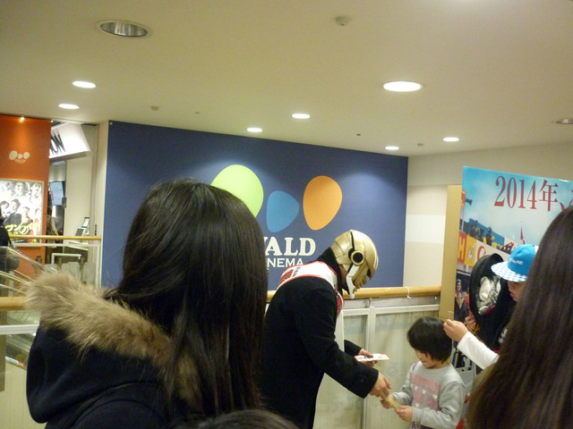ここは1時間ほど前は10人ぐらいしかファンが集まっていなかったのに、30分前に30人ほど、開始前にはなんと250人ほどがいっきにドーッと集まり、仮面宣伝マンを取り囲み始めた。