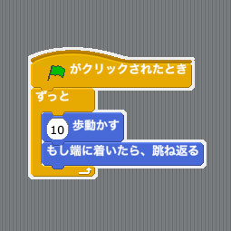 プログラムを実行すると、ネコはまず「ずっと」「10歩歩き」ます。そうしてずっと10歩歩いているうちに、ステージ(プログラム実行画面)の端に到達するので「もし端に着いたら、跳ね返る」が実行され、跳ね返ってまた移動しはじめます。そしてその動作を「ずっと」続ける、というわけです。