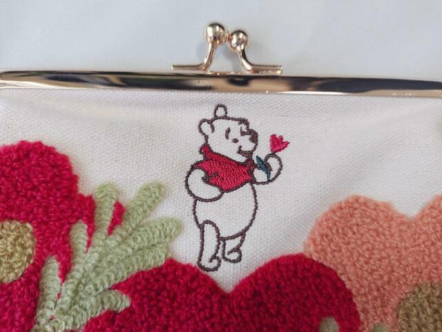 中央に刺繍された「プーさん」と、さがら織のお花を贅沢にあしらった「ポーチ」は、高級感があります。