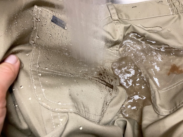 「超撥水チノペインターカーゴパンツ」はその撥水性で泥や砂、土汚れや食べこぼしなど子育て中の困った汚れも一瞬で弾いてしまいます。今までこのパンツを見つけていなかったことを後悔するくらい、素晴らしいパンツに出会えて感動です!