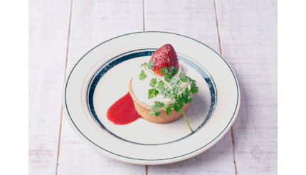2種の苺アイスと紅茶パンナコッタの華やかパフェは、紅茶のパンナコッタをベースに苺ジェラートやイチゴのショートケーキアイス、ホイップクリームをトッピングしており、食感が楽しいココアビスケットも散りばめ、フレッシュな苺を飾った苺パフェ。価格は760円。