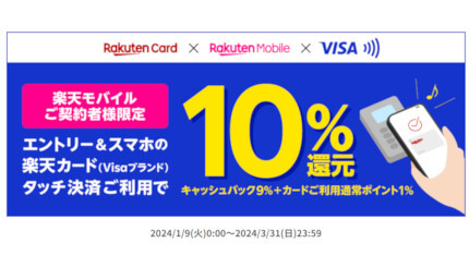 楽天カードは「通信」と「決済」を連携したキャンペーン「スマホのタッチで10%還元!」を1月9日からら3月31日まで実施する