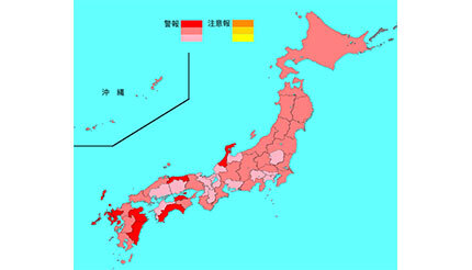 国立感染症研究所が1月12日に更新したインフルエンザの流行マップによると、2024年第1週(1月1~7日)の患者報告数は6万1918人という結果になった。なお、定点当たりの報告数は12.66となり、前週の21.65と比べて大幅に減少した。