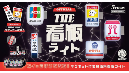 ラインアップは、「JCB」「ハマナカ手芸糸」「パールライス」「ビタワン」「日本盛」の全5種で、いずれも建物の外壁に取り付けられる「突き出し看板」タイプを再現した。本体下部のスイッチをオンにするとライトアップする仕様で、スイッチのオン/オフによって異なる雰囲気を醸し出せる。また、おまけとして各社のロゴ入りステッカーが1枚付属している。