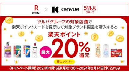 楽天ペイメントは1月15日~2月14日23時59分の期間、共通ポイントサービス「楽天ポイントカード」において、ツルハホールディングスが運営する「ツルハドラッグ」「くすりの福太郎といったドラッグストアで、「ツルハグループ限定!Kenvue対象商品を購入で、最大20%ポイント還元!」キャンペーンを実施する。