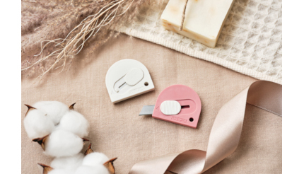 「タッチナイフR」は、日常の「ちょっと切りたい」場面に便利なミニカッターで、レトロかわいいデザインに、トレンドのくすみカラーを採用している。
