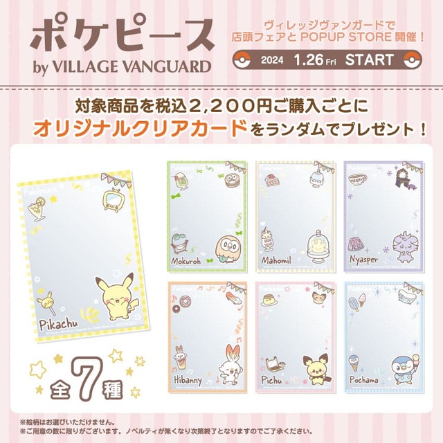 フェア実施200店舗とPOP UP STOREの池袋サンシャインシティアルタ、NAMBAなんなんの2店舗にて期間中に『ポケピース』対象商品を税込2,200円以上お買い上げで、ポケピースのなかまたちが描かれた限定ノベルティ「オリジナルクリアカード」をプレゼント!