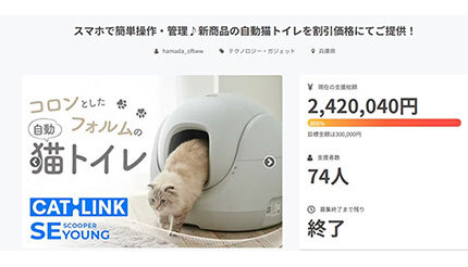 オーエフティー(OFT)は1月15日に、同社がクラウドファンディングサイト「CAMPFIRE」にて実施していた、自動猫トイレ「CATLINK SE YOUNG(キャットリンク エスイー ヤング)」の先行販売が、当初の目標だった30万円を大幅に超えて目標支援金額を達成したことを発表した。