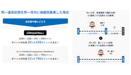 さらに、4月5日~5月31日の期間には、鉄道乗車ポイントサービスの開始にともなう「スタートアップキャンペーン」を実施する。同キャンペーンでは、定期券区間を除くICSF残高(チャージ残高)で、4月5日の始発から5月31日の終電までの、京急線分の利用金額が対象となり、カード式なら12%、モバイルPASMOまたはApple PayのPASMOなら20%分のポイントが付与される。