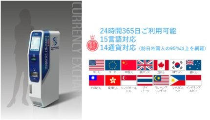 対応通貨は米ドル、ユーロ、英ポンド、中国元、韓国ウォン、香港ドル、台湾ドル、豪ドル、カナダドル、シンガポールドル、タイバーツ、フィリピンペソ、マレーシアリンギット、インドネシアルピアで、対応言語は日本語、英語、中国語、韓国語、ドイツ語など15カ国語。両替は外貨(紙幣)から円への両替のみで、1万円、1000円、100円に対応している。