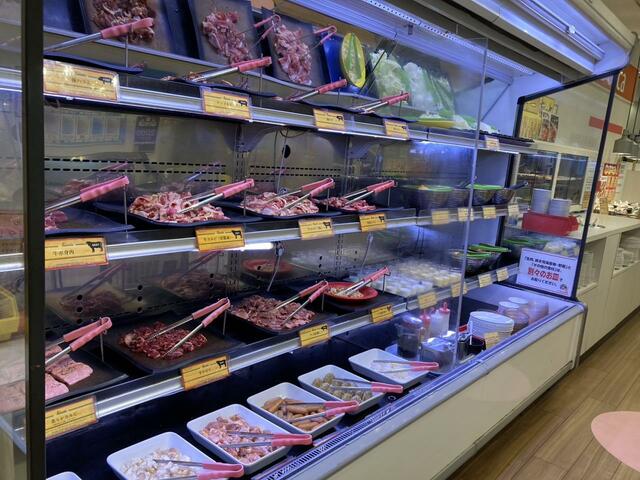 牛、豚、鶏、ホルモン、野菜、キムチ、フルーツなどが冷蔵ブースの中に綺麗に配置されています。