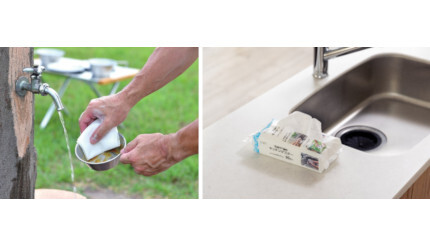 「洗剤付不織布キッチンダスター 50枚入」は、ダスターに洗剤が付いているため水に濡らして軽く揉むと簡単に泡立ち、持ち運びにも便利なので室内外問わず活躍する。