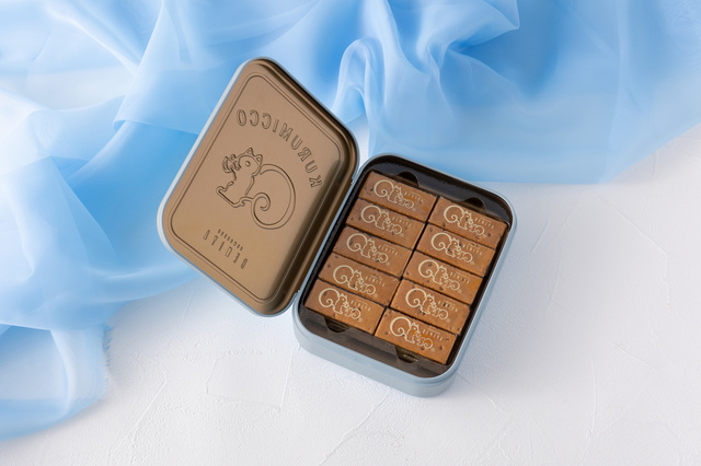 2024年は、爽やかさと優しさを感じる淡いくすみブルーの「クルミッ子10個入(缶)ペールブルー」が登場! 幸せを呼び込む色ともいわれている〈青色〉のやわらかいカラーにシンボルキャラクターのリスくんがエンボス加工されているデザイン缶です。価格は2,160円(税込)です。