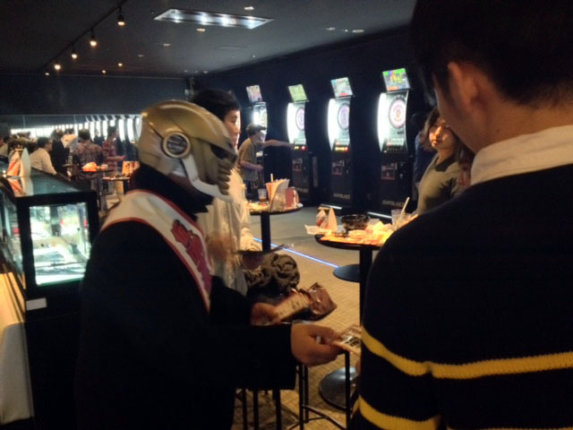 そして17時。いざ出陣となったが、下見のときの絶対的アウェーの状況は変わっていない。それでも、仮面宣伝マンは、ビリヤードやダーツを楽しんでいる人たちの邪魔にならないように、根気強く映画のレア・グッズを渡して宣伝をしていく。