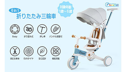 星テックは「Thinkmax」ブランドから、子どもの成長に合わせて6段階に形状を変えられる子ども用三輪車「6in1 子供三輪車」を発売している。カラーは、ライトブルー、黒&ホワイトの2色。価格は1万1450円。カゴ付きタイプの「5in1 子供三輪車」も用意している。価格は同じく1万1450円。
