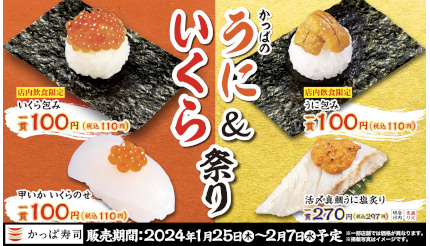 カッパ・クリエイトは1月25日~2月7日の期間、「かっぱ寿司」全店で「かっぱのうに&いくら祭り」を開催する。