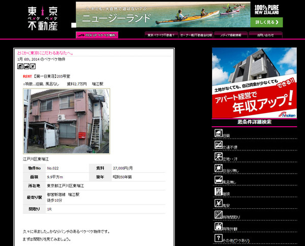 「とにかく東京にこだわるあなたへ」というキャッチフレーズで、「旧築」「交通不便」「日当たり無し」「極狭」「鬼安」「特殊外観」などのカテゴリーから選ぶことができます。