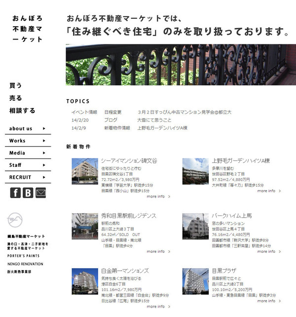 「住み継ぐべき住宅」のみを取り扱う売買専門の不動産屋さんです。築年数は決して新しいものはありませんが、だからこそにじみ出る味、空気感。おんぼろといっても、リノベーションされ、室内はきれいでオシャレなものが多く、また都心の物件を多く取り扱っているようです。