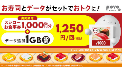 KDDIと沖縄セルラーは1月24日~31日23時59分の期間、「povo2.0」において、スシローで使える1000円分の食事券と、「povo2.0」の「1GB(30日間)」をセットにしたトッピング「【期間限定】スシローお食事券 1,000円分+データ1GB(30日間)」を提供する。トッピングの料金は1回あたり1250円。