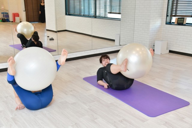 バランスボールをスネではさみ、上下させる