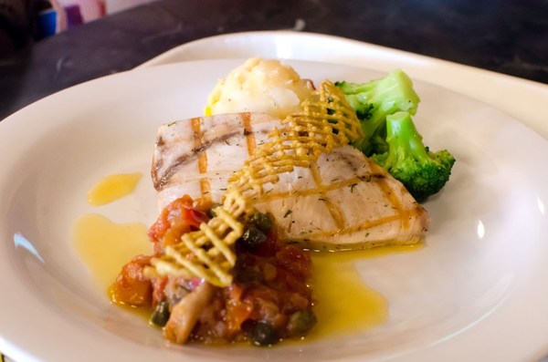 『クイーン・オブ・ハートのバンケットホール』の「メカジキのグリル、トマトケイパーソース」。ポテトサラダ以外は、しっかり糖質制限メニュー ©Disney