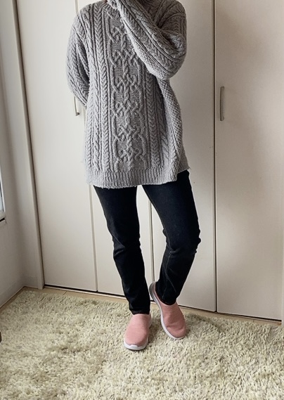 トップスは、シューズと合わせた明るい色が合うと思ったので、ライトグレーのセーターを合わせました。