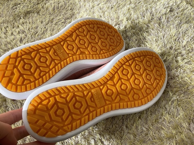 靴底を見ると確かにしっかりしたラバーがついています。床面がツルツルしていて滑りやすい我が家のベランダを歩いてみたところ、キュキュッといってしっかり地面をグリップしてくれました。