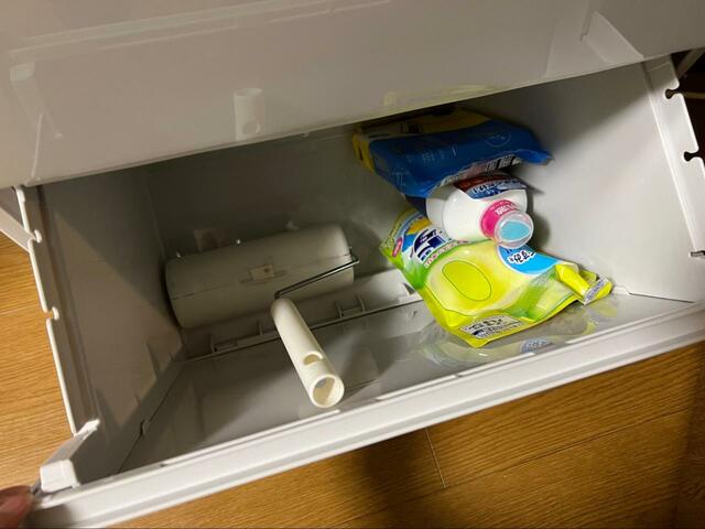 続いて、掃除用具を入れてみます。粘着クリーナーやウェットシートなどを入れてみました。容量も大きいですし、上から覗けるので物も探しやすそう。何より、掃除用具を入れても外から見えないのがポイント高いですね。