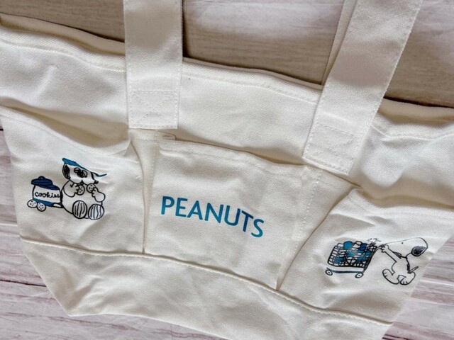 スヌーピーは、ショッピングカートを押してお買い物をしているイラスト。たくさん乗せている缶詰の上に、ウッドストックがちょこんと座っているのがかわいい〜!
