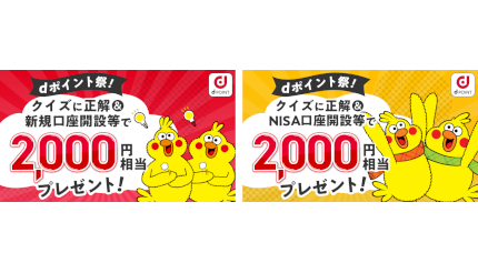 「dポイント2,000円相当!NISA口座開設キャンペーン」では、クイズに正解して同キャンペーンにエントリーし、期間中にマネックス証券でNISA口座を開設したうえでdポイントクラブ会員情報を登録するともれなくdポイント2000円相当をプレゼントする。キャンペーン期間は4月15日まで。