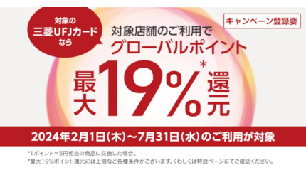 三菱UFJニコスは2月1日~7月31日の期間、「三菱UFJカード」の個人会員(一部を除く)を対象に、ポイント優遇加盟店での同カードの利用と各種サービスの登録・利用などに応じて最大19%相当(1ポイント=5円換算の商品に交換した場合)のグローバルポイントがたまる企画を開催する。