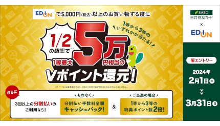 三井住友カードは2月1日~3月31日の期間、エディオンが運営する全国の「エディオン」「100満ボルト」店舗、およびエディオン公式オンラインショップでの対象となる買い物の際に、2分の1の確率でVポイントが当たり、分割払いがおトクになる「【三井住友カード×エディオン】エディオンでのお買い物の度に、1/2の確率でVポイントが当たる!1等最大5万ポイントプレゼント!」キャンペーンを実施する。