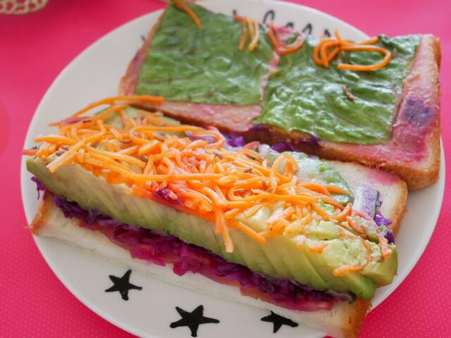 厚さ約6cmの断面の中身は、赤キャベツ、人参、アボカド、トマト、ひよこ豆等を使ったビーツフムス、ロメインレタス、胡瓜。