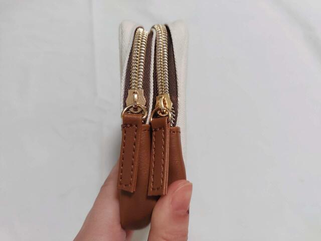 ポーチの底部(ボトム)と引き手は、高級感あるレザー調で、コの字型なのでガバッと開く仕様になっています。