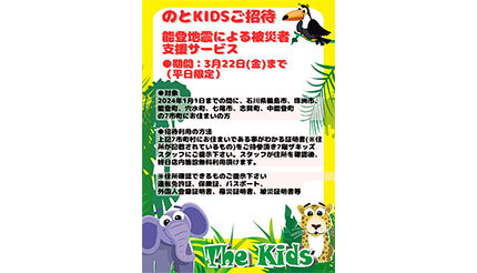 The Kidsは3月22日までの期間、令和6年能登半島地震の被災者支援サービスとして、対象地域に在住していた小学生以下の子ども、およびその保護者を、同社の運営する室内遊び場「ザキッズ 金沢エムザ店」(石川県金沢市)に、平日限定で無料招待する。