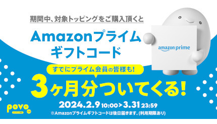 KDDIと沖縄セルラーは、「povo2.0」において、1万円以上のトッピングを購入すると1800円相当の「Amazonプライム 3カ月分」がついてくるキャンペーンを2月9日から3月31日まで開催する。