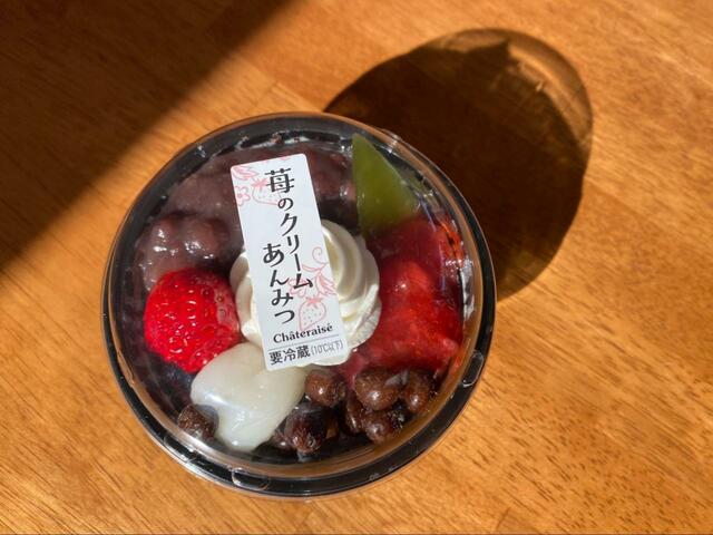 たっぷりの具材が入った贅沢な苺のクリームあんみつ。価格は税込334円と、他の苺スイーツよりやや高めですが、納得のボリュームです。
