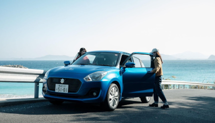 レンタカーの車種は、晴れ渡る空をイメージさせる鮮やかなブルーの「スズキ スイフト」で、フロントとバックにカラリトのロゴマークをあしらった。台数は5台を用意し、福江空港、福江港からの無料送迎付きなので、シームレスに五島列島の旅を楽しめる。