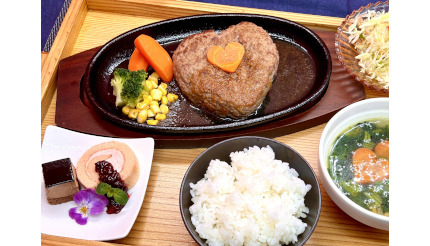 バレンタインプレートは、食欲をそそる和風ソースをかけたハート形でかわいいハンバーグと、ライス、スープ、サラダをセットにしたボリューム満点のメニュー。