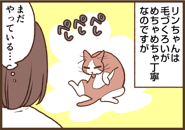 リンちゃんはもともと性格が繊細なのですが、だからなのか毛づくろいもものすご~~く長くしみじみとやっていて、若い頃はそれでもよかったのですが、10歳を超えたあたりから足とお腹の毛がずいぶん薄くなってしまって……。