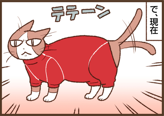このタイプの服を猫に着せるのは初めてだったんですが、見た目がものすごくかわいくて(笑)本人は若干不服そうですが、ハゲも治ってきたし、よかったです……。