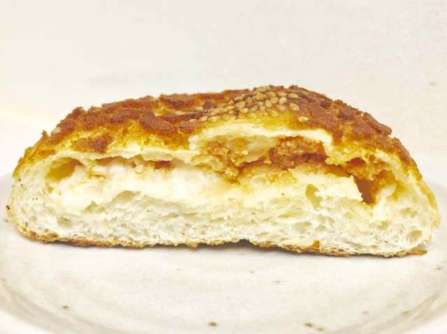 外側に上新粉を使った生地を上掛けしているのでしょう。ダッチパンのようにパリッとした外側と中に包まれたとろーっと軟らかいチーズと明太子の食感の違いが楽しいパンです。