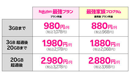 「最強家族プログラム」適用時は、毎月3GBまで、全キャリア最安値となる、月額税込968円(税別880円)で利用できる。月額料金は、3GB超20GBまでは2068円(税別1880円)、20GB超は3168円(税別2880円)。なお、「Rakuten最強プラン(データタイプ)」は対象外。